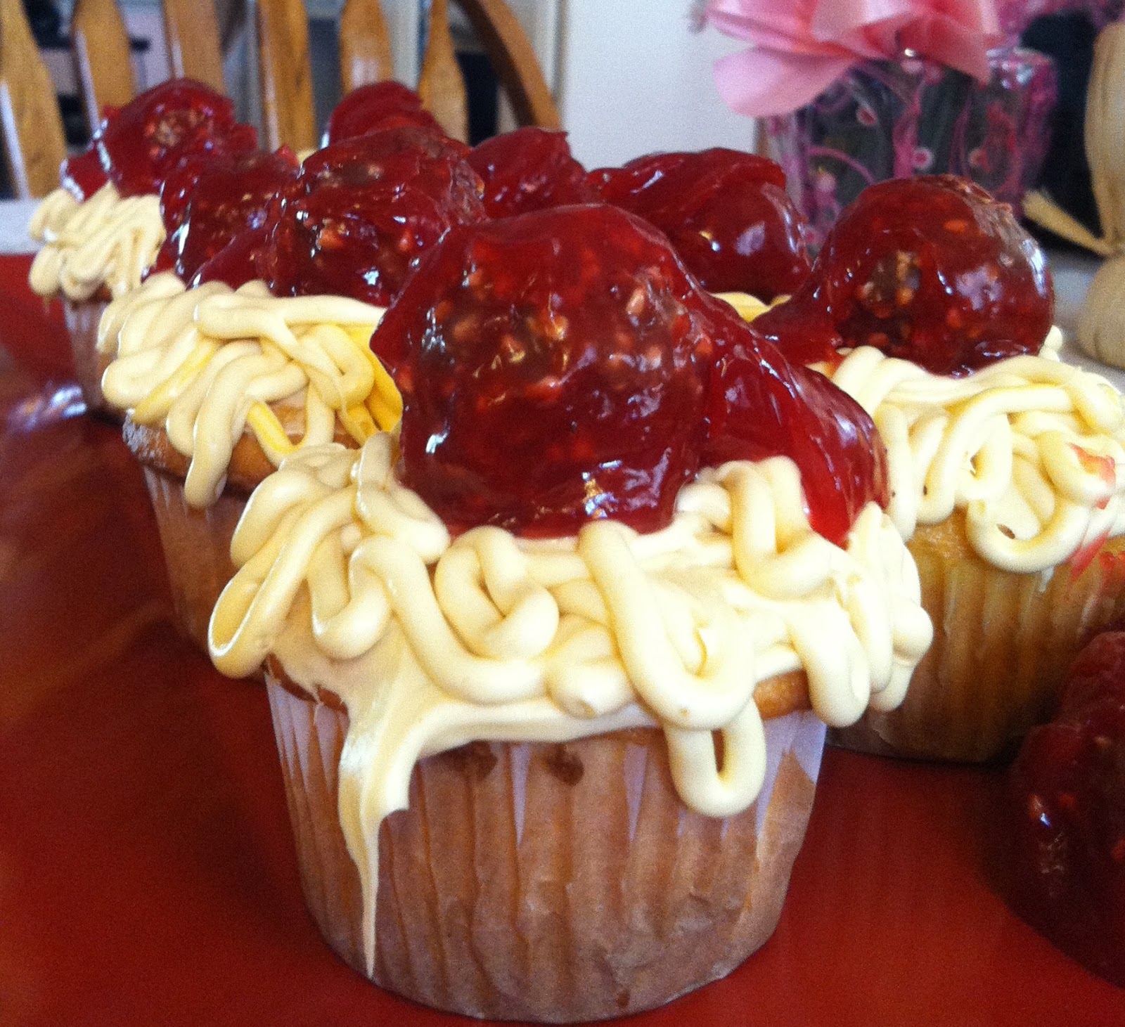 Once all the cupcakes were full of spaghetti frosting, I microwaved about a half a cup of strawberry jam in the microwave. I dropped my hazel nut candy balls into the jam topped each cupcake with a candy and drizzled the remaining jam on the cupcakes. They turned out AMAZING!